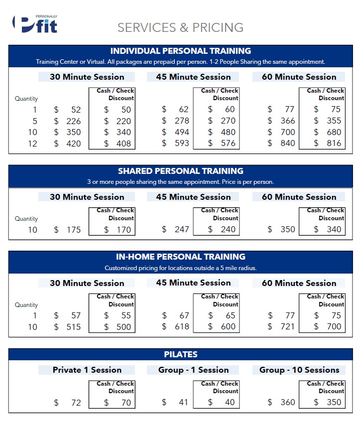 - Shared sessions (2 people) at the same rate as private sessions to allow fitness buddies, spouses or best friends to get fit together more affordably.